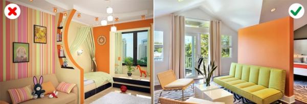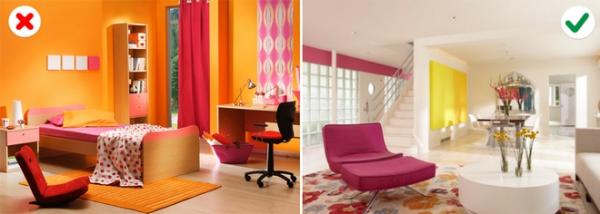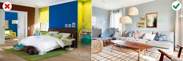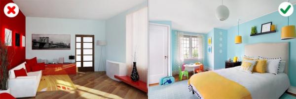 9. Chọn các cặp màu không phù hợp: Có một số nguyên tắc khi lựa chọn màu phối hợp. Bạn cần tìm hiểu kỹ tránh biến căn phòng thành chỗ đổ màu lộn xộn, gây rối mắt.