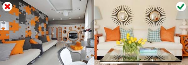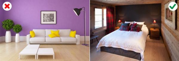 Bạn sẽ thấy mệt mỏi, bực bội khi nhà có quá nhiều màu nóng hay u tối. Hãy xem 10 cách phối màu sai lầm dưới đây (trái) và cách phối đúng (phải).