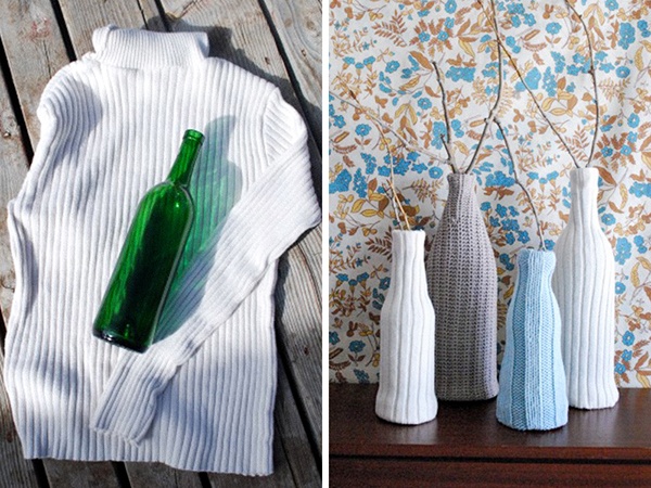 Hãy tái sinh cho một chiếc áo len cũ bằng cách bọc chúng bên ngoài chai thủy tinh hoặc một chiếc lọ bất kỳ. Hãy đo kích thước chiếc lọ và may vỏ bọc từ áo len có kích thước tương ứng, sau đó bọc chúng ra bên ngoài lọ.
