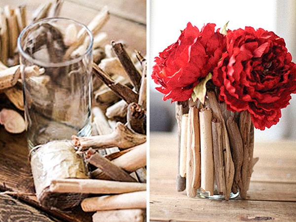 Nhặt những thanh củi, gỗ vụn có kích thước vừa phải. Sau đó bạn dùng keo để dán chúng dọc thân lộ. Một chiếc lọ hoa từ củi, gỗ mang tới vẻ dung dị, thanh thản như khi bạn về với tự nhiên. Đồng thời, màu sắc thô mộc của củi sẽ giúp những bông hoa của bạn càng trở nên rực rỡ, nổi bật.