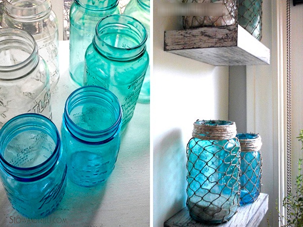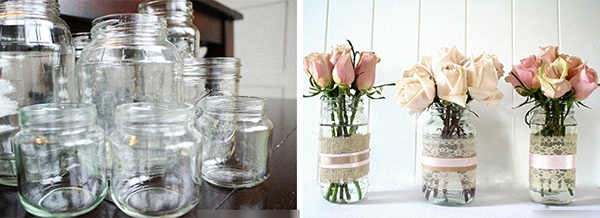 Những chiếc lọ thủy tinh đơn giản sẽ mang một màu sắc mới lạ khi bạn chỉ việc thêm một vài chi tiết trang trí đơn giản như mảnh vải ren và ruy băng. Chúng sẽ giúp căn phòng của bạn trở nên lãng mạn đến không ngờ và đậm phong cách vintage.