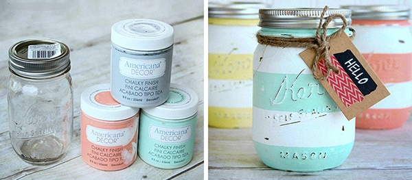 Vẫn với cách sơn những đường sọc ngang, nhưng kết hợp màu trắng và sắc màu pastel, bạn sẽ có những chiếc lọ hoa với màu sắc tươi sáng và trang nhã. Hãy gắn thêm một tấm tag buộc ngang lọ để sản phẩm của bạn càng thêm ấn tượng.
