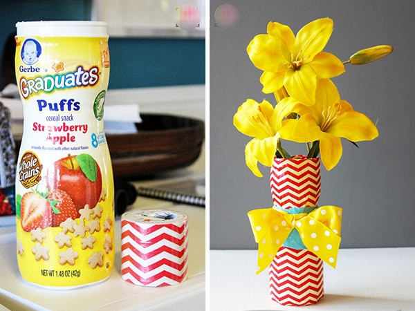 Tận dụng những chiếc vỏ hộp nhựa hoặc giấy, bạn có thể dùng giấy gói quà, hoặc các loại băng dính màu sắc để dán trang trí xung quanh lọ. Sau đó, dùng ruy-băng để buộc bên ngoài, vậy là bạn đã có một chiếc lọ đặc sắc như một gói quà để cắm hoa.