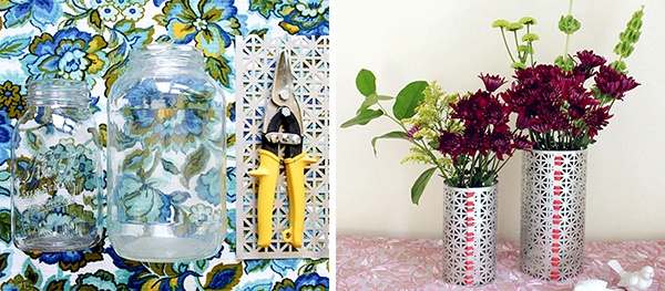 Bạn có thể mua các tấm sắt, rào mỏng trang trí tại các cửa hàng bán đồ xây dựng, sắt thép. Tất cả những gì bạn cần làm là uống công tấm sắt bằng kích thước bên ngoài lọ thủy tinh tương ứng, sau đó dùng dây chắc, hoặc dây len để buộc cố định 2 đầu nối lại.