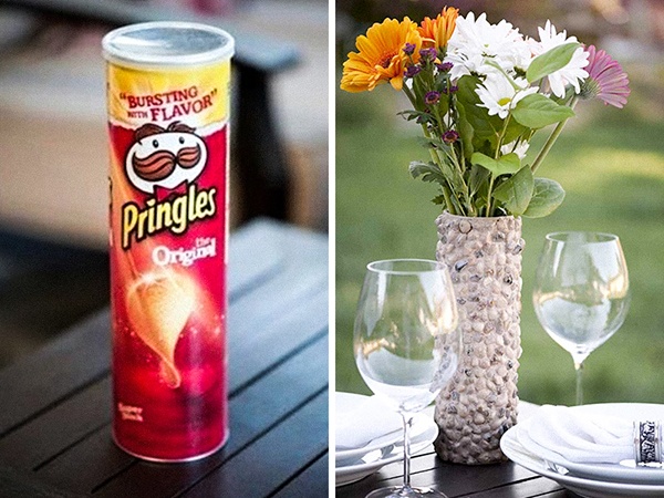 Bạn có thể tận dụng những vỏ hộp giấy hoặc nhựa vứt đi như hộp đựng khoai tây. Sau đó dùng keo dán dán các viên sỏi, đá lên trên. Vậy là bạn đã có một chiếc lọ hoa bằng sỏi, đá vô cùng dân dã và gần gũi tự nhiên.