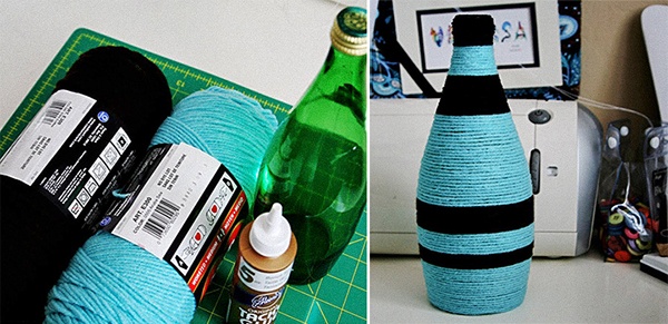 Dùng các sợi len bôi lớp keo mỏng và cuốn đều xung quanh chai thủy tinh, vậy là bạn đã có chiếc lọ hoa vô cùng đặc biệt và êm ái. Bạn có thể sáng tạo thêm những hình trang trí cũng bằng len phía ngoài, hoặc trang trí bằng những đường chéo thay vì sọc ngang như trong hình.