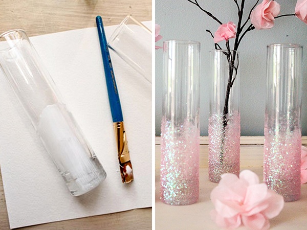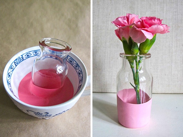 Chiếc lọ hoa vô cùng đáng yêu này lại được thực hiện hết sức đơn giản. Bạn chỉ việc nhúng đáy lọ thủy tinh vào lớp sơn một màu.