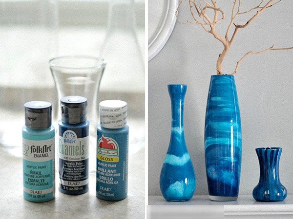 Khó tin được chiếc bình tuyệt đẹp như được mài ra từ một phiến đá này lại cũng có thể được làm chỉ từ sơn màu. Hãy đổ từ 2-3 màu sơn cùng tông màu nhưng sắc độ khác nhau vào phía trong lọ thủy tinh và nhẹ nhàng xoay lọ để tạo được những hiệu ứng pha trộn màu tuyệt đẹp.