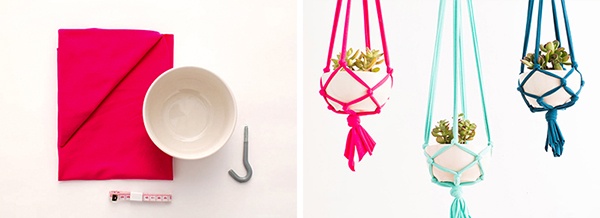 Dùng một miếng vải hoặc áo cũ có chất co giãn và không tuột sợi, cắt thành những sợi đều nhau. Sau đó bạn làm một chiếc túi lưới bằng cách thắt các nút cách đều nhau như cách làm túi thị. Sau đó dùng một chiếc bát hoặc lọ hoa dạng rộng miệng để có được một chiếc giỏ hoa treo thú vị.