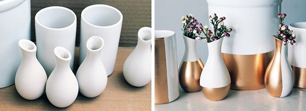 Bạn hãy dùng lọ hoa chất liệu gốm sứ, sau đó nhúng vào màu sơn ánh kim để có được những chiếc lọ hoa trông vô cùng nghệ thuật như trong hình.