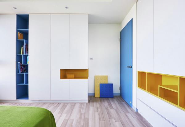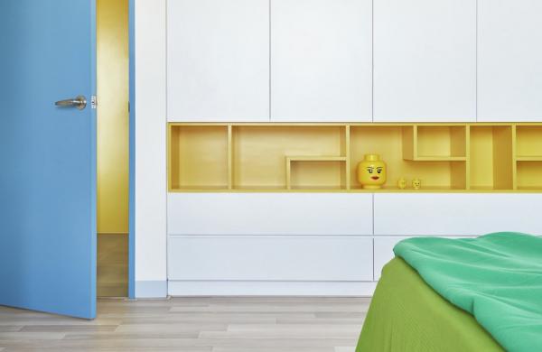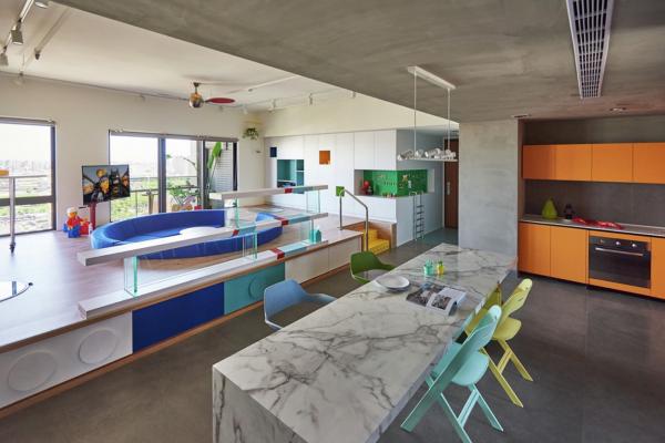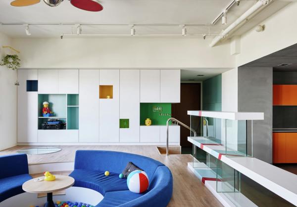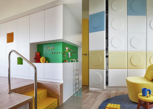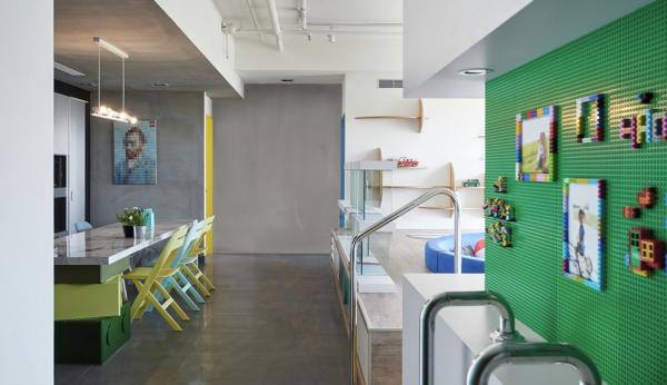 Những chi tiết lấy cảm hứng từ Lego tràn ngập khắp mọi nơi bên trong căn hộ, với những bậc thang, những mảng tường bằng miếng lego cỡ lớn. Những chậu cây trong nhà cũng được biến tấu giống với những miếng ghép Lego đa sắc màu. Những thiết kế nội thất khéo léo dựa trên mẫu hình của bộ ghép hình Lego, cùng với những sắc màu rực rỡ tạo cho căn hộ một không gian sống sinh động, tươi vui, đầy sức sống.