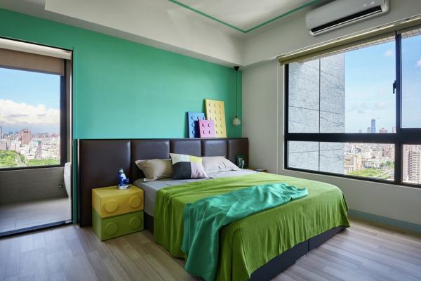 Phòng ngủ được thiết kế thoáng mát với những khung cửa kính cỡ lớn, với những tông màu chủ đạo của Lego. Những chiếc tủ cũng được thiết kế đầy ấn tượng, lạ mắt, độc nhất vô nhị. Những miếng ghép Lego lần nữa lại được sử dụng tạo thành chiếc bàn nhỏ đầu giường.