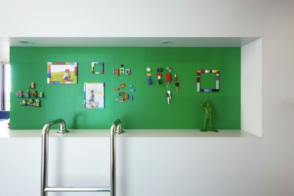Không khó để nhận ra những chi tiết như bậc thang, tường trong căn hộ cũng được thiết kế tựa như những mảnh ghép hình Lego. Căn hộ còn dành riêng một khoảng tường để thỏa sức sáng tạo với những mảng xếp hình Lego. Mảng tường như một góc tiện ích được sử dụng với nhiều mục đích khác nhau như để trưng bày những mẫu hình Lego, trưng bày tranh ảnh, để móc chìa khóa và vô vàn công dụng khác nữa.