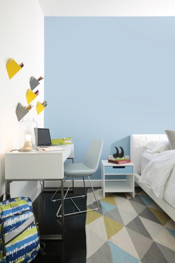 Chọn sơn tổng thể với màu sáng như be, trắng, xanh nhạt để phòng góc học tập của con thoáng hơn.