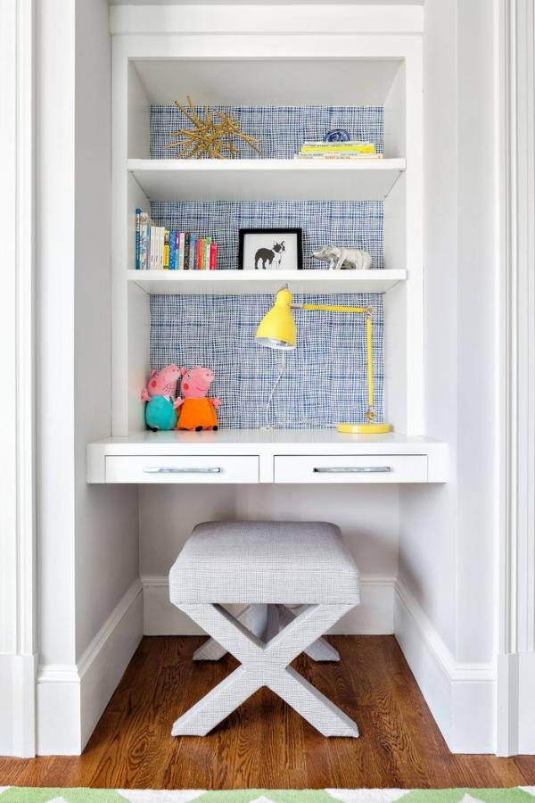 Có thể thêm kệ treo tường để đồ dùng học tập và sách vở luôn ngay ngắn, gọn gàng.